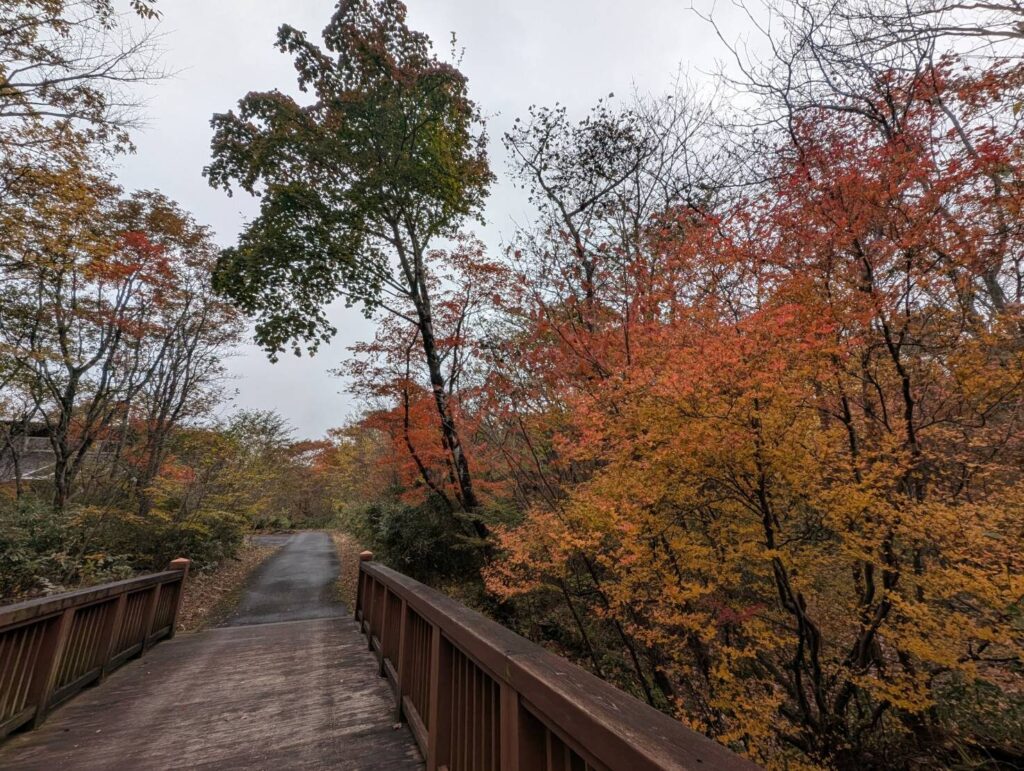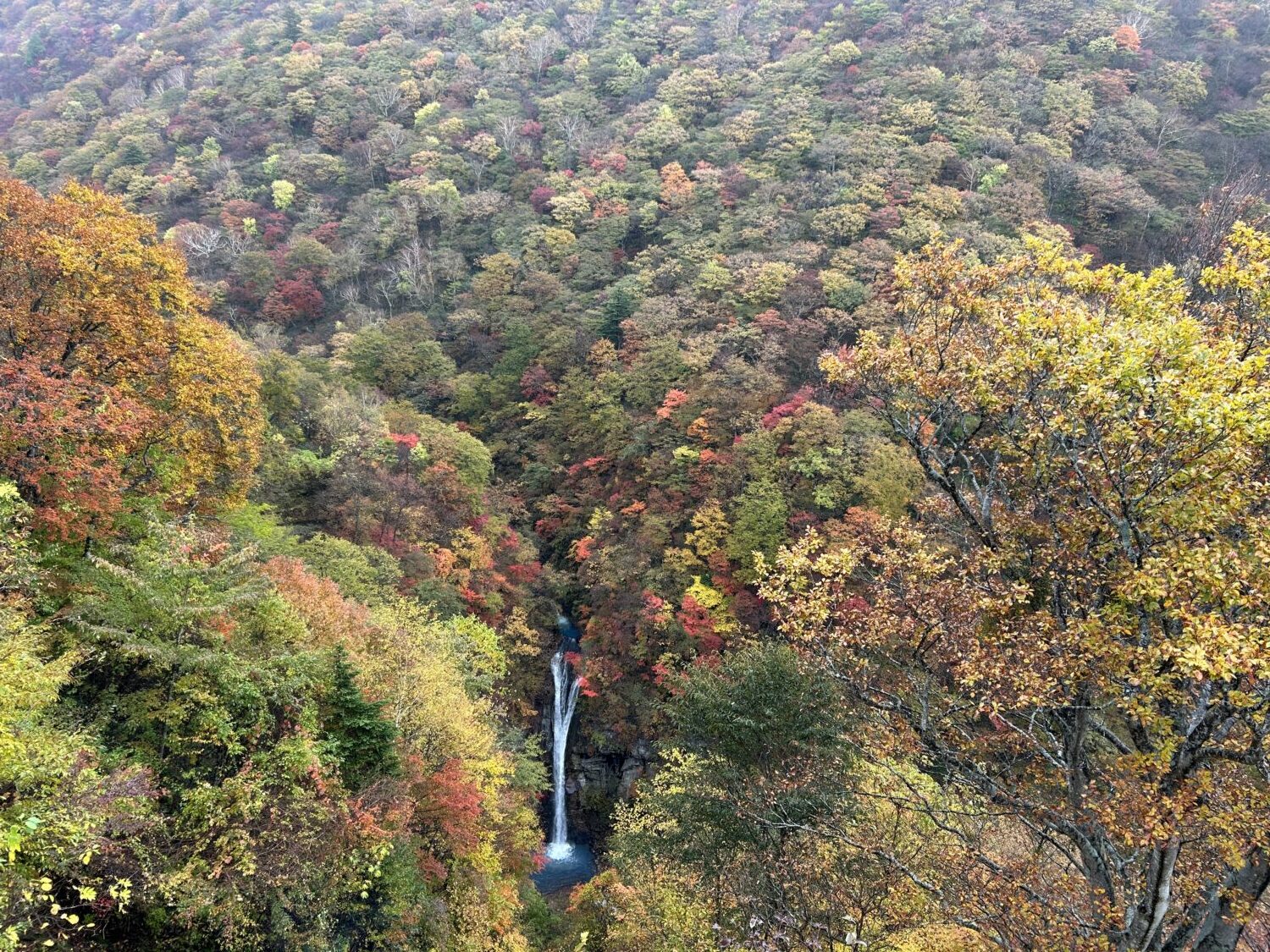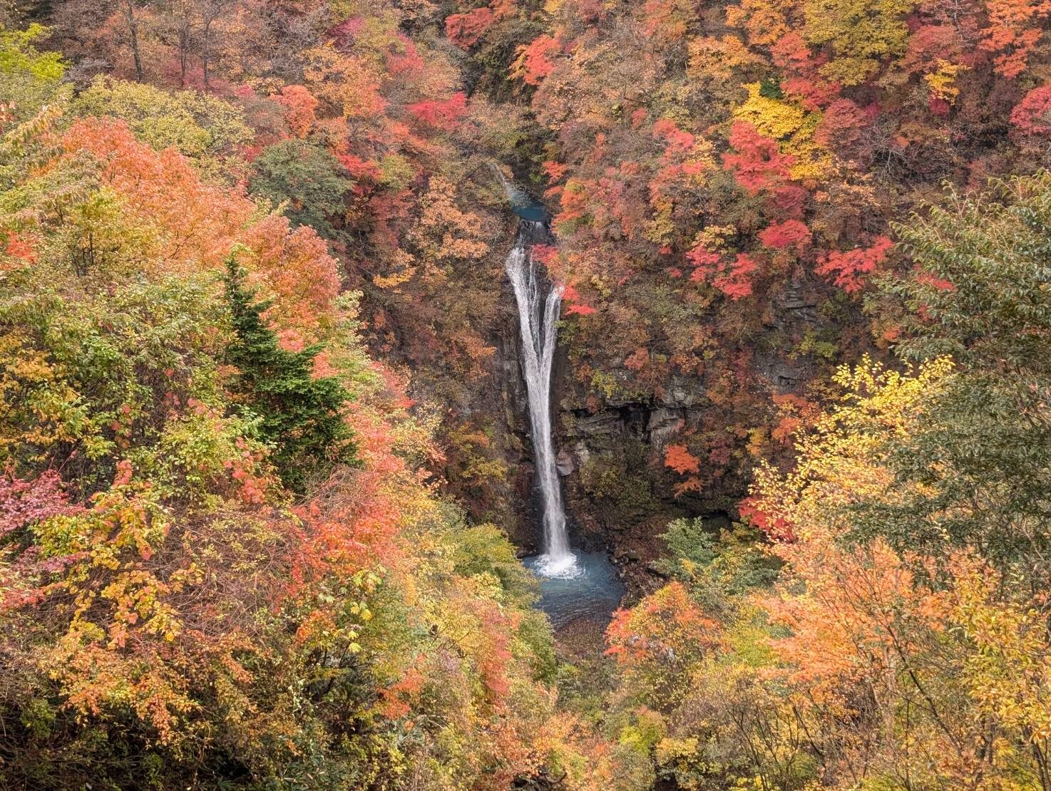 青い滝壺が綺麗に見れました。まだ葉が緑の樹もあるとはいえ、これから落葉してボリュームが減ることを考えると今日がピークと言えそうですね。