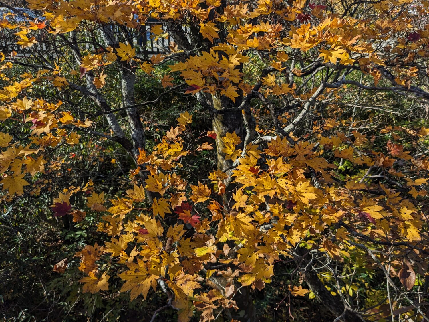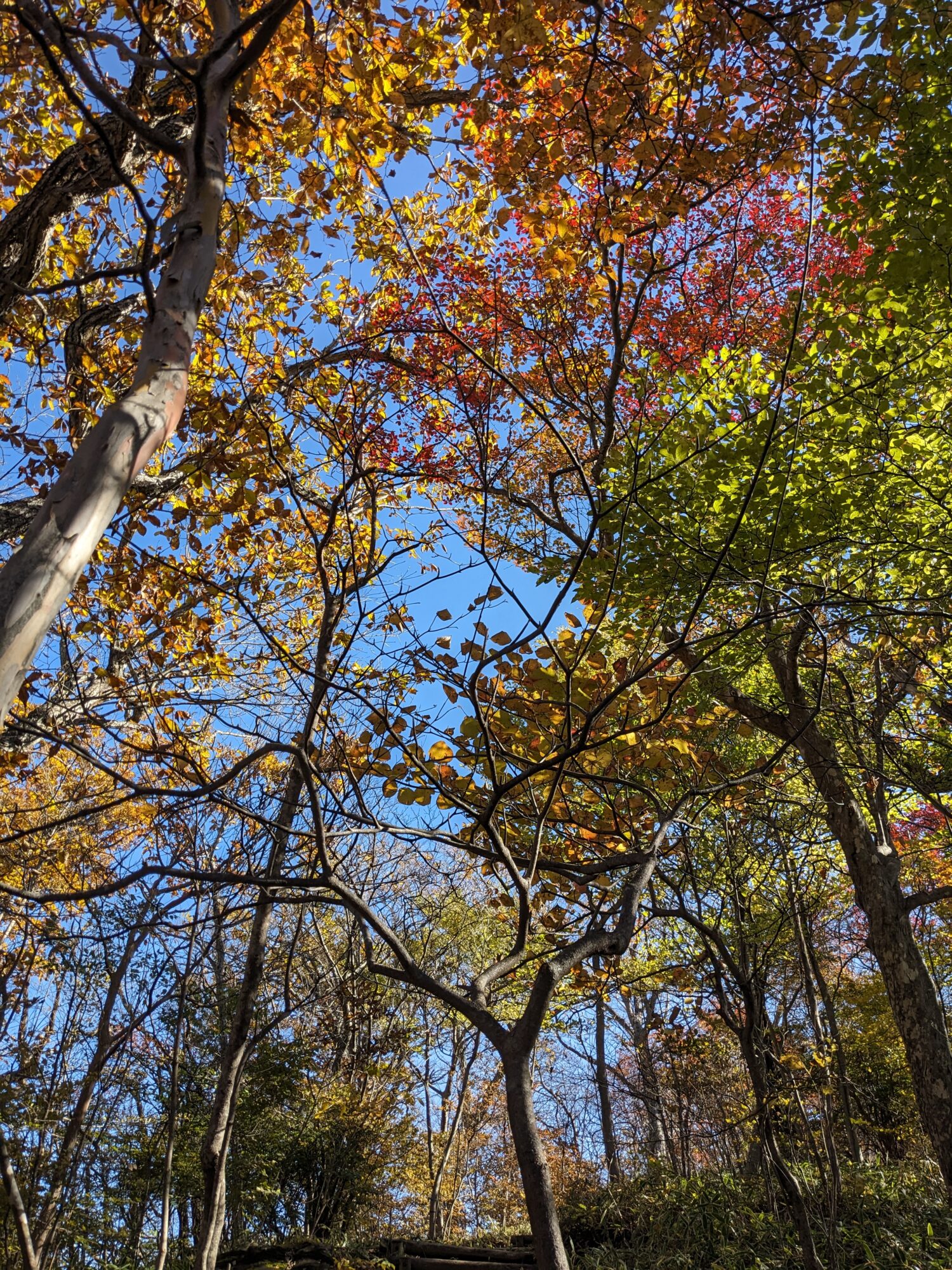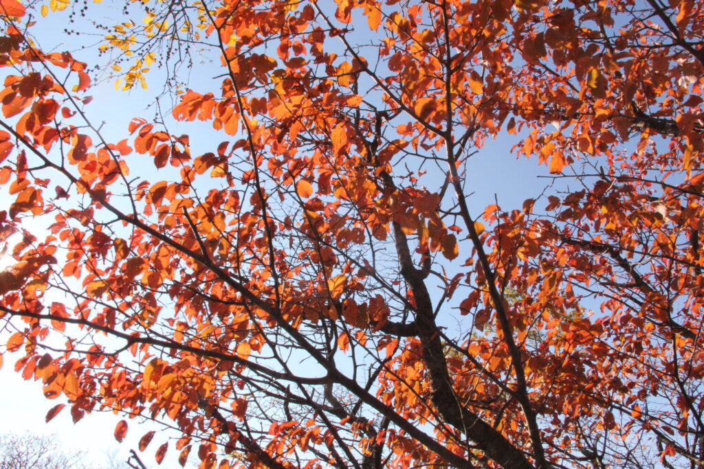 駒止の滝周辺を見回してもカエデ類、ツツジ類、サクラにアオハダ・・・様々な樹種が紅、黄と色付いており、青空を背景にしてとても美しかったです。